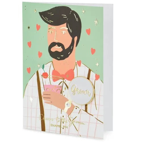 Ευχετήρια κάρτα ‘Cheers to the Groom’ και μαζί αποσπώμενη μεταλλική καρφίτσα Groom! Γράψε τις ευχές σου για τον γαμπρό σε αυτήν την ξεχωριστή κάρτα με την καρφίτσα groom που μπορεί να φορέσει στο bachelor πάρτυ!