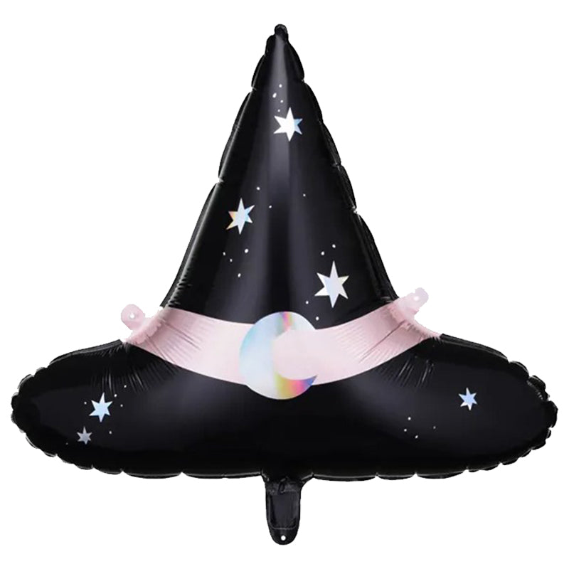 Μπαλόνι foil junior shape 26'' x 22'' (66,5cm x 57,5cm) μαύρο καπέλο μάγισσας στολισμένο με ασημί αστέρια και ένα φεγγάρι (ιριδίζον) με κορδέλα rose gold